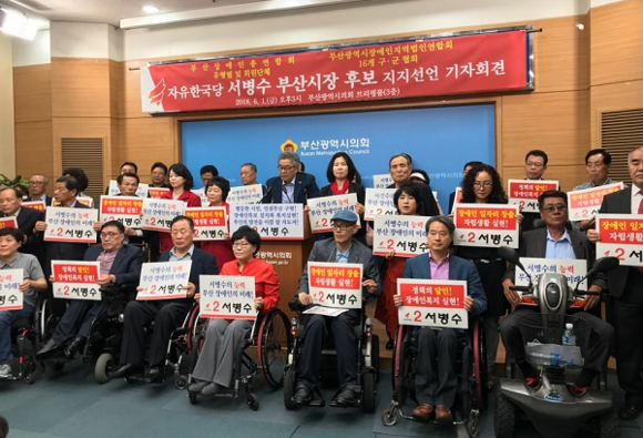부산장애인총연합회는 1일 부산시의회 브리핑룸에서 기자회견을 갖고 "부산 장애인들의 복지증진과 인권향상을 위해 자유한국당 서병수 부산시장 후보를 적극 지지한다"고 선언했다.