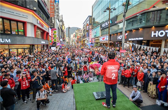 ▲3일 부산 서면 쥬디스태화 일대에서 열린 한국당 서병수 부산시장 후보의 유세에 시민들이 운집한 모습. (사진=서병수 캠프)