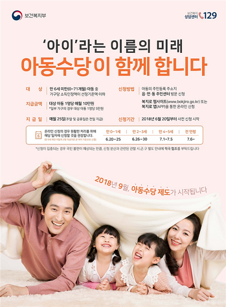 아동수당은 오는 9월부터 시행하며, 만 0~6세 미만(0~71개월, 2012년 10월 1일 이후 출생)의 아동으로 가구의 소득 재산 수준이(소득인정액) 선정 기준액 이하인 경우 월 10만원 지급된다.
