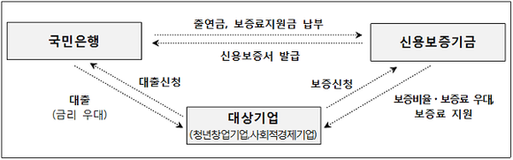 신보는 국민은행이 출연한 보증료지원금 10억원을 통해 대상기업의 보증료를 매년 0.3%p씩 5년간 지원하고, 국민은행은 우대금리(기준금리+0.65%~0.8%)를 적용할 예정이다.