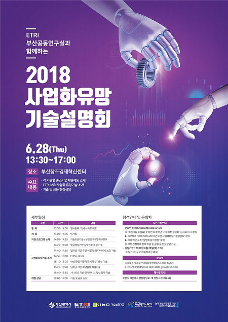부산시와 ETRI(한국전자통신연구원)는 지난해에 이어 올해 두 번째로 'ETRI 유망기술 설명회'를 오는 28일 오후 1시 30분 부산창조경제혁신센터 4층 콘퍼런스 룸에서 개최한다.