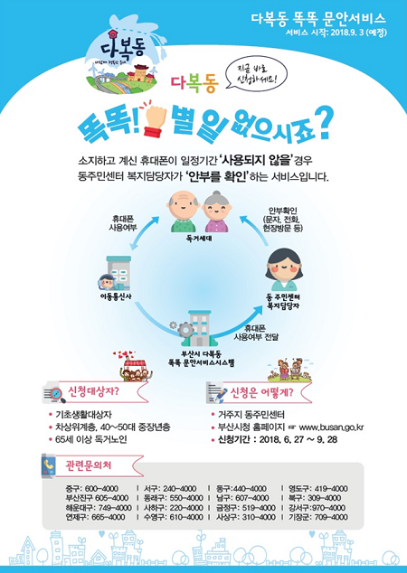 부산시는 9월 3일부터 휴대전화 통화기록 상태를 분석해 안부를 확인하는 서비스인 '다복동 똑똑 문안 서비스'를 시작한다고 27일 밝혔다.