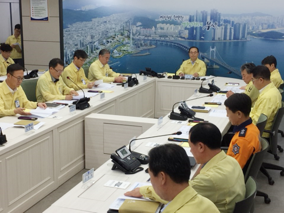 ▲오거돈 부산시장이 1일 오전 부산시청에서 호우경보로 인한 긴급 대책회의를 갖고 있다. (사진=부산시)