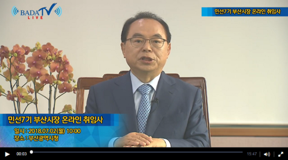 한편 이날 시 인터넷방송 바다TV를 통해 생중계한 취임사는 바다TV를 비롯한 네이버, 유튜브, 다음카카오, 아프리카TV, 판도라TV 등을 통해 시청할 수 있다.