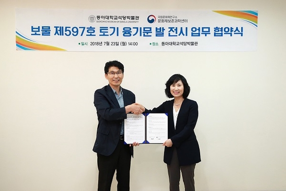 동아대학교 석당박물관은 지난 23일 석당박물관 소회의실에서 국립문화재연구소 문화재보존과학센터와 협약을 갖고 오는 9월부터 12월까지 보물 제597호 '토기 융기문 발'을 주제로 한 전시회를 개최한다고 25일 밝혔다.