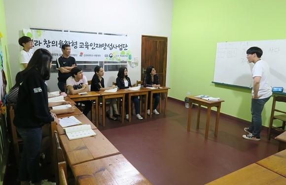 ▲신라대 꿈다함 봉사단이 파라과이 현지인들에게 한글 강의를 하는 모습. (사진=신라대)