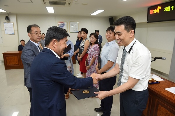 ▲허성곤 김해시장(왼쪽)이 제1기 주민참여예산위원들에게 위촉장을 각각 전달하며 악수를 하고 있다. (사진=김해시)