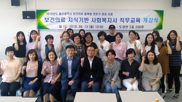 춘해보건대학교는 13일 도생관에서 2018년 울산시 일자리사업 일환으로 보건의료 융복합 전문기관 양성사업 '보건의료 지식기반 사회복지사 직무교육' 개강식을 가졌다.