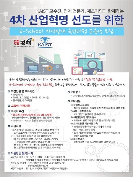 경남 김해시는 KAIST와 공동으로 추진하는 '4차 산업혁명 맞춤형 지역인재 육성 프로그램(E-School)' 교육생의 모집기간을 오는 17일까지 연장한다고 14일 밝혔다.