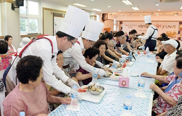 ▲부산은행은 16일 부산 동구노인종합복지관에서 지역 어르신 1만여명을 대상으로 여름철 대표 보양식인 삼계탕 나눔 행사를 가졌다. (사진=부산은행)