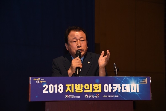 ▲김형수 김해시의회 의장이 17일 대구에서 열린 '2018년 지방의회 아카데미'에서 특강을 하는 모습. (사진=김해시의회)