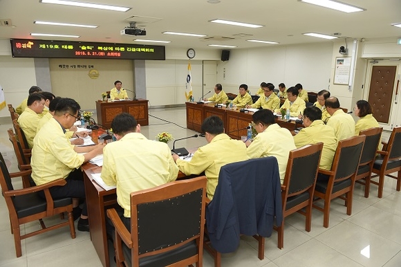 경남 김해시는 21일 소회의실에서 제19호 태풍 '솔릭'의 북상에 따라 선제적 대응을 위해 긴급 실·국장 대책회의를 개최했다.