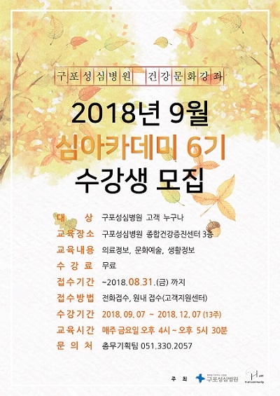 구포성심병원은 내달 7일부터 12월 7일까지 매주 금요일 오후 4시부터 5시 30분까지 총 13주의 과정으로 심(心)아카데미 6기를 개설한다고 22일 밝혔다.