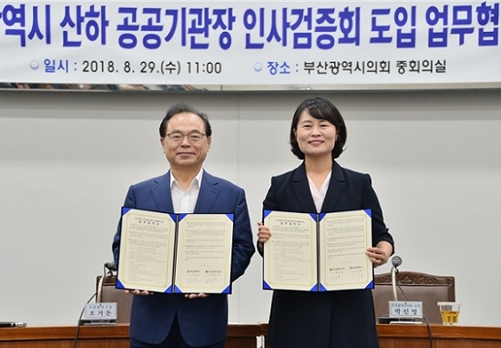 부산시와 부산시의회는 오거돈 시장과 박인영 의장이 참석한 가운데 29일 오전 11시 시의회 중회의실(2층)에서 '부산광역시 산하 공공기관장 인사검증회 도입 업무협약식'을 가졌다.