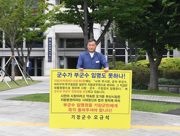 오규석 기장군수가 4일 오후 점심시간을 이용해 부산시청 시민광장 앞에서 부산시로부터 부군수 임명권 반환을 촉구하는 일곱 번째 1인 시위를 하고 있다. (사진=기장군)