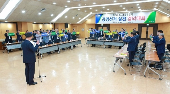 경남농협은 11일 대회의실에서 경남을 대표하는 대의원조합장과 임직원 60여명이 참석한 가운데 내년 3월에 실시되는 제2회 동시조합장선거가 공명선거가 되도록 실천을 다짐하는 결의대회를 개최했다.