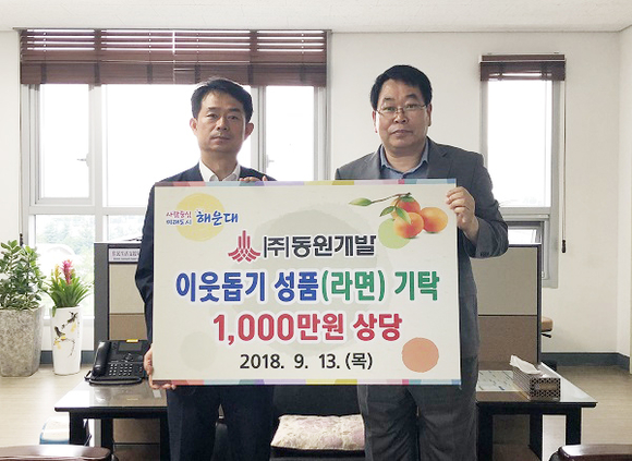 동원개발(회장 장복만)은 13일 추석 명절을 맞아 저소득 취약계층에 전해달라며 1천만 원 상당의 라면 600박스를 부산 해운대구청에 기탁했다. (사진=해운대구)