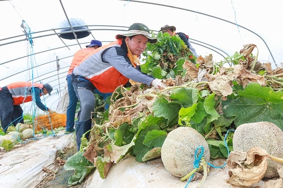 이날 일손돕기에는 김석균 본부장을 비롯한 경남농협 임직원 40여명이 참여해 비닐하우스 내 작물 제거 작업에 구슬땀을 흘렸다.