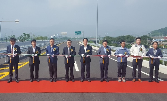 ▲밀양역과 삼랑진 구간을 연결하는 58번 국도 개통식에서 내빈들이 테이프 커팅 전 기념촬영을 하고 있다. (사진=밀양시)
