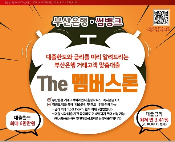 BNK부산은행은 우수고객 대상 사전승인 신용대출 상품인 'The 멤버스론'을 출시했다고 19일 밝혔다.
