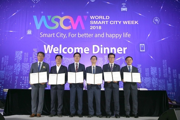 ▲허성곤 김해시장(맨 오른쪽)은 지난 18일 '제2회 월드 스마트시티 위크 2018' 개막식에서 기성시가지 지역 수요에 최적화된 스마트시티 서비스를 제공하는 테마형 특화단지의 성공적인 추진을 위해 국토부 차관, LH 사장, 대전시장, 충북도지사, 부천시장과 업무협약을 체결했다. (사진=김해시)