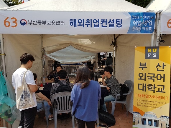 부산외국어대학교 대학일자리센터는 지난 18일 열린 '2018 부산대 취업∙창업 한마당 박람회'에서 해외취업에 관심 있는 지역 대학생들을 위한 해외취업컨설팅을 실시했다.