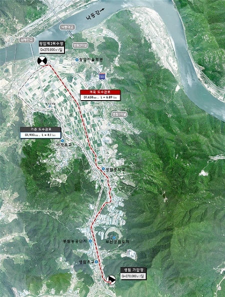본 사업은 지난 2011년 1월 16일 발생된 생림가압장 도수관로 누수사고와 관련해 나흘간 시 전역 수돗물 공급 중단 사태 등에 대비하기 위한 사업의 일환으로 김해시는 총사업비 386억원을 들여 창암취수장~생림가압장까지 L=6.89km 구간에 D=1650mm 도수관로를 매설해 공급계통을 복선화하는 사업으로, 지난해 7월에 설계를 착수해 올 6월 설계를 완료하고, 이달에 공사를 착공, `21년 9월까지 공사를 완료할 계획으로 추진에 박차를 가하고 있다.
