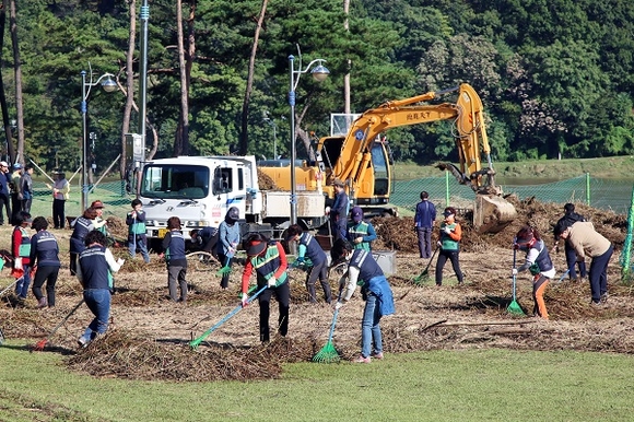 ▲태풍 '콩레이' 피해지역인 밀양시 삼문동 야외공연장 주변 환경정비 모습. (사진=밀양시)