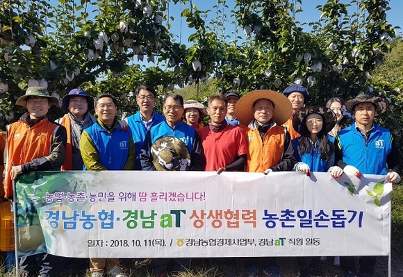 경남농협과 aT 경남지역본부 임직원들은 11일 진주시 문산읍에서 배 수확에 어려움을 겪고 있는 농가를 위해 일손돕기에 나섰다.