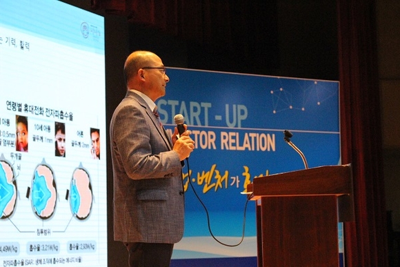 ▲창원대의 투자IR 벤처포럼에서 '아이템사업화' 지원을 받는 (주)니나노의 오현석 대표가 발표를 하고 있는 모습. (사진=창원대)