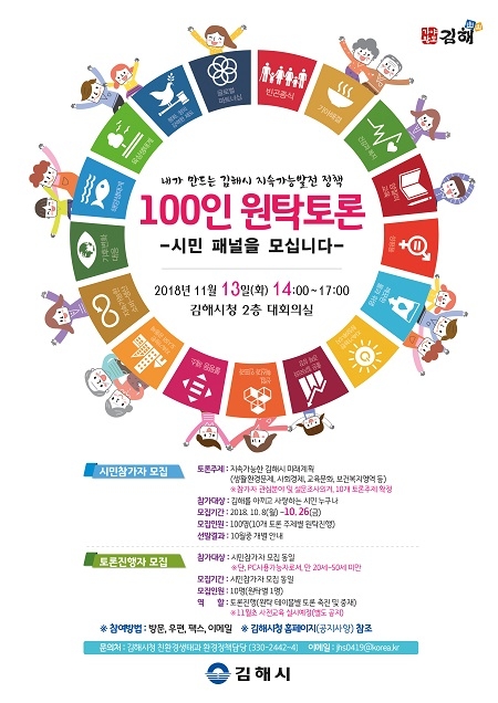 경남 김해시는 김해형 지속가능발전목표 수립을 위한 시민이해와 정책 방향을 모색하기 위해 다음달 13일 시청대회의실에서 100인 원탁토론을 개최한다고 12일 밝혔다.