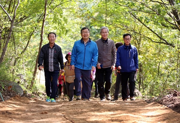 ▲박일호 밀양시장(맨 앞줄)과 시민들이 재약산 사자평 생태탐방 코스를 걷고 있는 모습. (사진=밀양시)