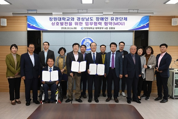창원대학교는 16일 오후 대학본부 6층 상황실에서 경상남도 장애인 유관단체와 장애인 생산품 우선구매 활성화를 통한 지역 장애인 직업재활 및 생활안정 등 상호발전 협무협약을 체결했다.