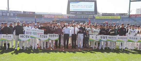 ▲'제1회 농협은행 경남본부장배 공공기관·직장인 야구대회' 개막식 단체 기념촬영 모습. (사진=경남농협)