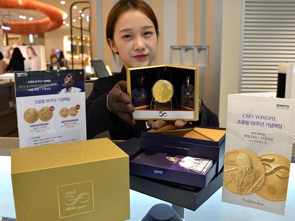 롯데백화점 골든듀 매장에서 23일부터 11월 4일까지 조용필 50주년 기념메달 선착순 예약판매를 진행하는 가운데, 부산본점 골든듀 매장에서 직원이 기념메달을 소개하고 있다. (사진=롯데쇼핑)