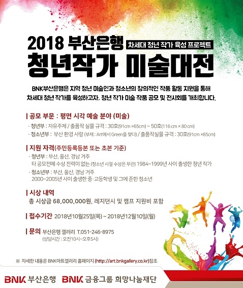 BNK부산은행은 창립 51주년을 맞아 부·울·경 지역 차세대 청년 작가 육성 프로젝트의 일환으로 '청년작가 미술대전'을 개최한다고 24일 밝혔다.