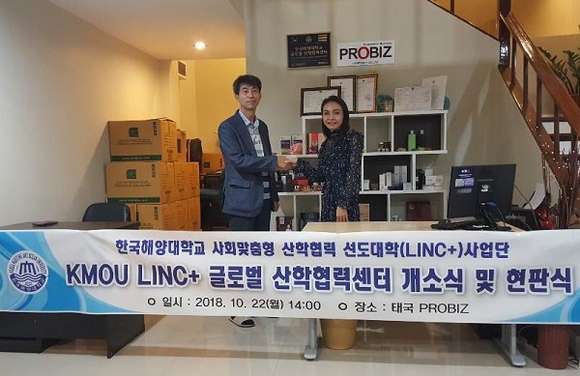 한국해양대학교는 태국 방콕 프로비즈(PROBIZ) 본사에서 '태국 글로벌 산학협력센터'를 개소하고 현판식을 가졌다고 24일 밝혔다.