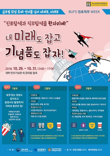 부산외국어대학교는 오는 29일부터 31일까지 남산동캠퍼스에서 재학생들과 청년구직자들에게 진로탐색의 기회를 제공하고 각 직무별 특강과 국내외 취업을 위한 멘토링 등 다양한 프로그램으로 '진로·취업 Week' 페스티벌을 연다고 25일 밝혔다.