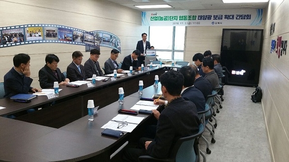 경남 김해시는 2일 시청 일자리상황실에서 경남도, 한국에너지공단, 한국산업단지공단, 한국수력원자력 및 산업(농공)단지 입주 기업 대표 및 사무국장 등 20여명이 참석한 가운데 '산업(농공)단지 협동조합 태양광 보급 확대'를 위한 간담회를 열고 사업 추진을 본격화했다.