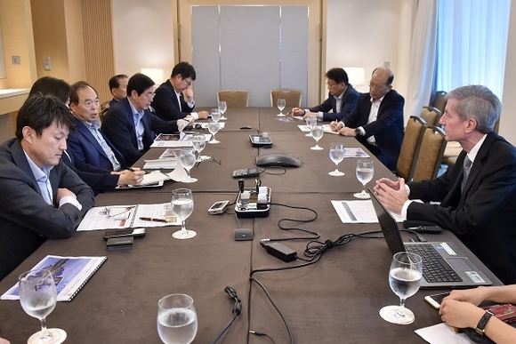 ▲지난달 31일 싱가포르를 방문한 오 시장 등 부산시 방문단이 마리나 베이 샌즈 CEO(오른쪽)와 면담를 갖고 있다. (사진=부산시)