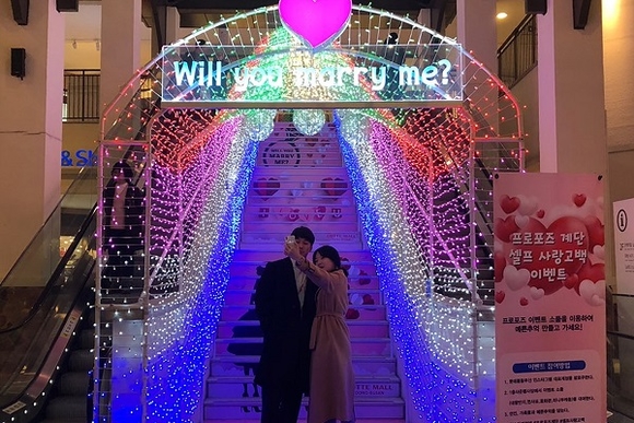 롯데 아울렛 동부산점은 최근 '프로포즈 계단'을 설치, 대왕반지, 면사포, 꽃화관, 미니 부케 등을 대여해 셀프 프로포즈를 할 수 있는 이벤트를 진행 중이다. 인스타그램에 올려 채택이 되면 소정의 선물도 증정하는 이번 행사는 12월 말까지 진행된다. (사진=롯데쇼핑)