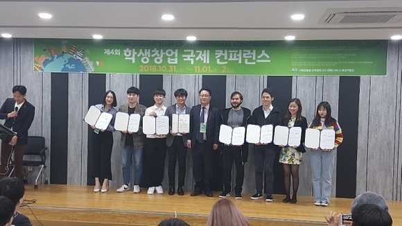 ▲'제4회 학생창업 국제 컨퍼런스'에서 창원대 창업동아리 'BENEW' 팀이 청년창업가상을 수상하고 기념촬영을 하고 있다. (사진=창원대)