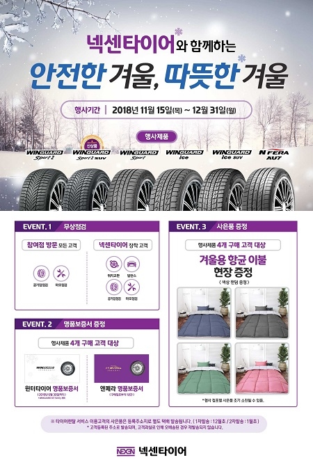 넥센타이어가 다가오는 겨울 시즌을 맞아 고객 사은 이벤트를 진행한다고 15일 밝혔다.