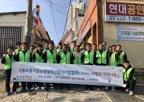 신용보증기금 부산경남영업본부는 한국경영혁신중소기업협회(메인비즈협회) 부산울산경남연합회와 19일 부산 연제구 지역 영세가정에 동절기 난방을 위한 연탄(3300장)을 구입, 각 가정에 배달하는 사회공헌활동을 펼쳤다.