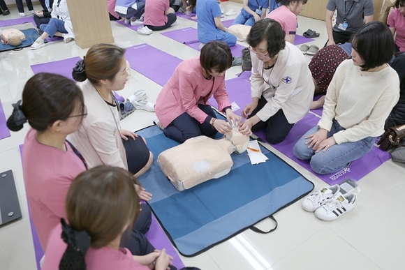 이번 교육은 전 직원을 대상으로 가정 및 병원에서 응급환자를 발견했을 경우 신속하게 대처할 수 있도록 이론과 실습을 병행했다. 마네킹 모형을 활용해 인공호흡, 심폐소생술 실습교육과 자동심장충격기(자동제세동기-AED) 사용법 등 응급상황 시 행동요령에 대한 교육이 집중적으로 이뤄졌다.