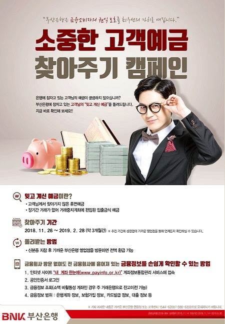 BNK부산은행은 고객중심경영 실천과 금융소비자 권익보호를 위해 '소중한 고객예금 찾아주기 운동'을 내년 2월 말까지 약 3개월간 집중 실시한다고 26일 밝혔다.