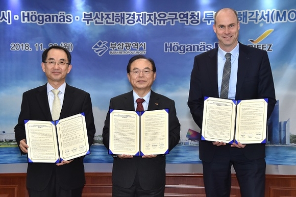부산시는 26일 오후 시청 26층 회의실에서 오거돈 시장, 진양현 부산진해경제자유구역청장, 마크 브레이쓰웨이트 회가내스 아태지역 총괄사장, 리카드 몰린 한국 지사장 등이 참석한 가운데, 스웨덴 회가내스(Höganäs)社와 신증설 투자양해각서(MOU)를 체결했다.