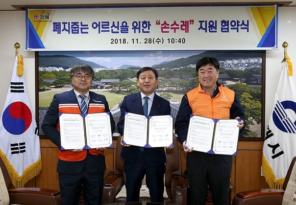 28일 시장실에서 폐지줍는 어르신 손수레 지원 협약식(김해시, 경남도자원봉사센터, 한화지상방산)을 진행했다.