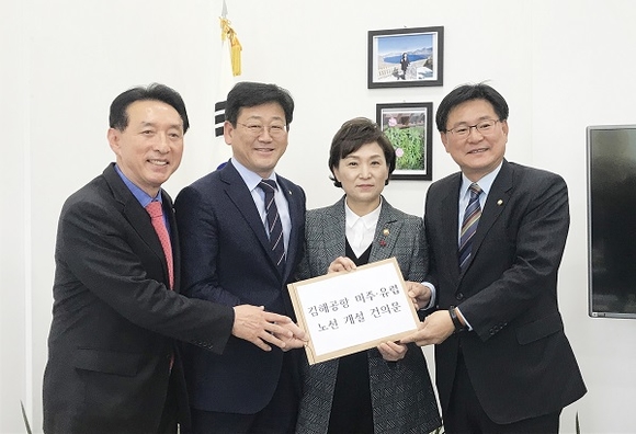 국회 김정호, 김석기, 박재호, 이헌승 의원을 비롯한 국토교통위 의원과 김영춘 해양수산부 장관, 부울경 및 대구경북 의원 등 52명의 여야 국회의원들이 28일 김해공항 미주, 유럽 등 중·장거리 국제노선 신설을 촉구하는 연대서명을 하고 김현미 국토부 장관에게 '대정부 건의문'을 전달했다.