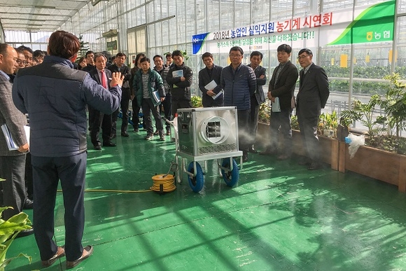 시연회에서는 농협중앙회가 농업인에게 무상 보급한 무인분무기(동력연무기) 5대를 교육관 내 온실에 설치하고 농기계 실무자 및 농업인에게 작동방법 및 약해 유의사항 등을 교육한 후 실제 무인방제기를 약 20분간 가동했다.